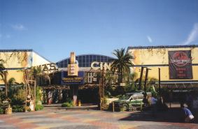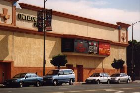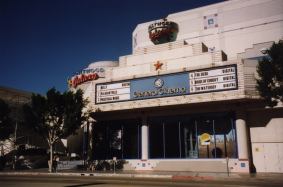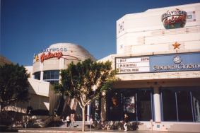 Universal City is famous for the Studios Universal, which opened their doors to the public, to become one of the main amusement parks in the country. In 1987, the Canadian company opened a state of the art eighteen-screen 6000-seat multiplex. As of the opening, the equipment was remarkable: all auditoriums are equipped with Dolby Stereo, fourteen of them have THX label. On the first level are theaters 1 through 14, located symmetrically (theaters 1 and 14 are identical, so are theaters 2 and 13...), all with THX. Theaters 1 and 14 are the largest, with 800 seats each, on the main floor and the balcony, but the screens are only 30 ft wide, and are too high to allow comfortable viewing. Theaters 2 through 13 are medium sized (250 to 350 seats), and "1.85" decent screens. On the second floor are located the smallest auditoriums, theaters 15 through 18, with 200 seats each. The lobby is huge. Even though I was disappointed in the two largest auditoriums, the cinema was one of the more encouraging attempts to renew the concept of multiple screen theaters. Let's not forget that at this time, THX theaters were few in our Paris, France (well, this is even worse today...) Since then, the complex had to compete with newer and larger multiplexes, and during remodelling, it got larger screens. There is still THX, but also digital sound (mainly DTS, because of Universal, and some SDDS). Major movies are played in several auditoriums (up to eight!), with success, because of huges grosses and full auditoriums. The complex, located near a new Hard Rock Cafe, is now the starting point of "Universal City Walk", a car-free street, recently built, with numerous shops, bars and restaurants, crowded on week-end nights, leading to the studios.