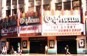 Downtown Los Angeles attracts few tourists.On Broadway, many huge and luxurious palaces were built in the 20's. It is now a hispanic neighborhood, and most of the large movie theaters closed down gradually since 1985, but their fronts suffered few changes, and remain the witness of a glorious past. Of all this cinemas, only the Orpheum, a beautiful 2,200-seat-theater built in 1926, survived; it still plays double bills, sometimes subtitled in Spanish.