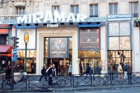 On peut voir la belle façade du Miramar dès la sortie du métro. Ce complexe de trois salles fait partie du circuit Rytman, très important dans le quartier. Les deux plus grandes salles sont nées de la division de l'ancienne grande salle de mille places. Comme les autres cinémas du circuit, les salles étaient équipées de pendules (pour éviter aux spectateurs de rater leur train?), qui semblaient gêner les cinéphiles, notamment le claquement lors du changement de chiffre à chaque minute.