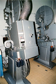 La cabine de la salle 1 se trouve au sommet du bâtiment. Elle possède deux projecteurs de type "rock-and-roll" (haut-droite et ci-contre). Ci-dessus à gauche, la cabine principale.