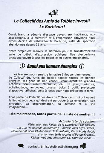 L'info est venue le 8 décembre d'un message posté par Jacques dans le forum. Le Barbizon, ce cinéma abandonné et semble-t-il oublié de tous, s'est vu investir par une cinquantaine de personnes, le "Collectif des amis de Tolbiac", un ensemble d'associations particulièrement diverses. Leur but, faire revivre la salle, d'après le tract du collectif, en tant que "salle de débat, d'expression publique, lieu d'expérience artistique ouvert à tous les possibles et autres imaginaires"; notons que le terme "salle de projection" cité par Jacques est absent des utilisations prévues de la salle. Ces personnes ont débuté symboliquement leur action en retirant les palissades qui ont obstrué la façade durant deux décennies.