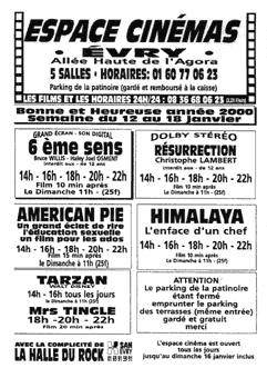 ![]() Le dernier programme Le dimanche 16 Janvier 2000, le projet est définitif, et l'Espace Cinéma vit son dernier jour. On organise alors une grande fête, où tous les billets seront vendus au prix de 25 francs, chaque spectateur recevant une glace gratuite. Entre temps, CGR (Circuit Georges Raymond) a racheté le cinéma. En 2001, un Méga-CGR tout neuf (le second de la région après Mantes-La-Jolie) ouvrira ses portes au public. La clientèle s'était raréfiée ces derniers temps. Les travaux maintes fois reportés avaient fini par convaincre une partie des spectateurs que le cinéma était déjà fermé. La fréquentation était parfois difficile, en particulier à l'occasion des séances de minuit le samedi, qui drainaient les bandes du voisinage et décourageaient le reste du public. La sécurité aux abords du cinéma était également devenue un problème. Pour l'avoir fait, je peux certifier que ce n'était pas facile, pour les gens du quartier, de traverser le centre commercial déserté après une séance nocturne. Le problème des voitures a été en particulier résolu après la mise en place d'un parking payant et gardé, qui connut un succès certain auprès du public. En attendant la réouverture, le public se reportera sur les seize salles du Pathé de Belle-Epine et les trois salles de l'Arcel Corbeil, qui offrent un équipement sonore remarquable; les personnes non-motorisées devront probablement se passer de cinéma. Le dernier très gros succès du complexe fut Titanic. Une seule copie était projetée dans les deux grandes salles; les séances étaient décalées, et toutes les 90 minutes, l'opérateur devait faire passer les bobines d'un projecteur à l'autre. Le générique de fin était supprimé. L'exercice était à la fois exaltant et épuisant pour les projectionnistes.